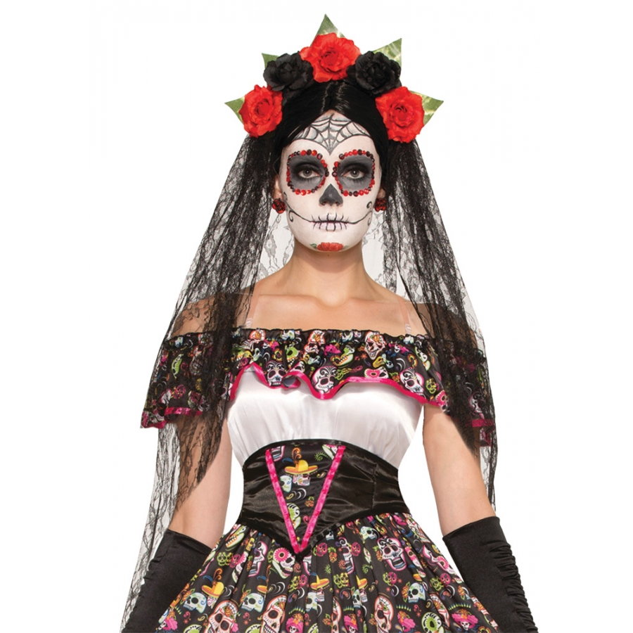 DAY OF DEAD VEIL. A very exotic black veil headband that is the perfect accessory to any ladies, Day of the Dead costume. Long black veil on sides and back attached to a headpiece containing 5 roses (3 of which are red and 2 are black) and green leaf behind each rose. One size fits most.