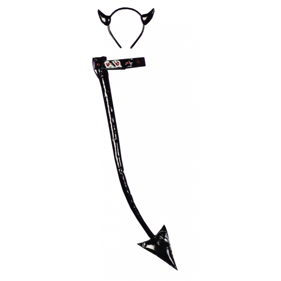 DEVIL SET BLACK LEATHER LIKE. Matching leather-like headpiece and tail. Simply add your own tights and leotard and you have an instant costume. Plastic gemstone accents.