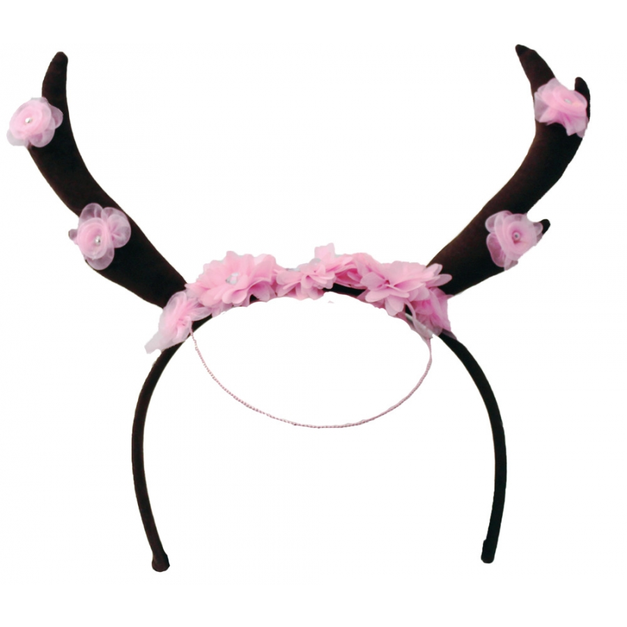 FLORAL STUDDED ANTLER TIARA. The perfect accessory for your fairy nymph or goddess cosplays! Antler headband has sheer ribbon rosettes with rhinestone centers and a delicate pink chain to accent your forehead! Pretty! One size fits most.