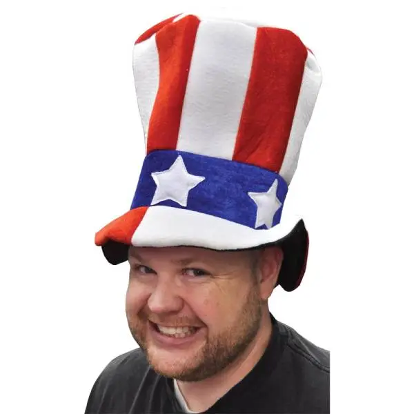 Fun and funky Uncle Sam Hat has the traditional red, white, and blue stars and stripes! Soft and comfortable to wear, this hat will fit most adults. Great for patriotic events, picnics, fireworks displays, parades, and anytime you want to inspire fun and love of country.Â