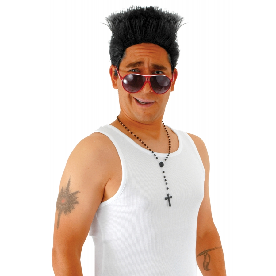 GUIDO KIT. Kit includes a black wig with synthetic short hair in a a spiky style that is mesh lined. The kit also includes a black rosary necklace and black sunglasses. (Glasses are not red as pictured) One size fits all.