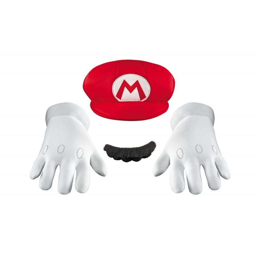 MARIO ACCESSORY KIT ADULT. Hat, pair of gloves and self-adhesive faux mustache. One size fits most adults.