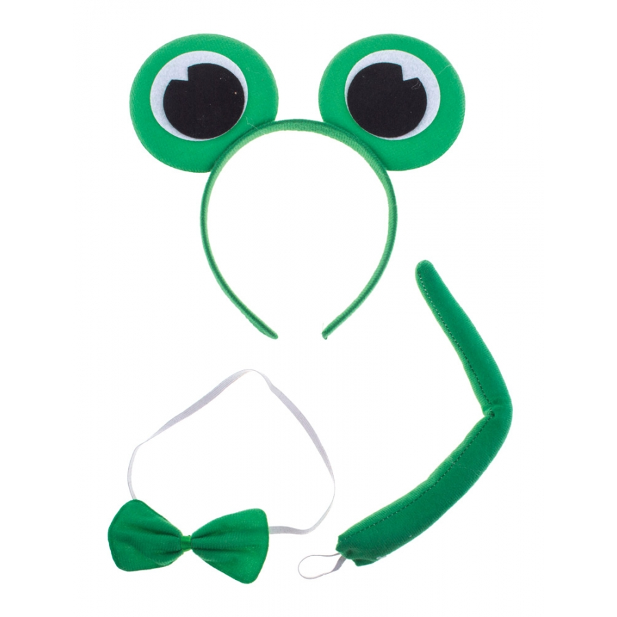 PLAYSET-FROG-3 PC. Cute 3-piece Set includes a headband with big Frog eyes, matching bow tie on an elastic band, and a matching felt tail with a loop for pinning onto your costume. You could add a green unitard or long-sleeved tee and leggings for a simple but great look! One size fits all.