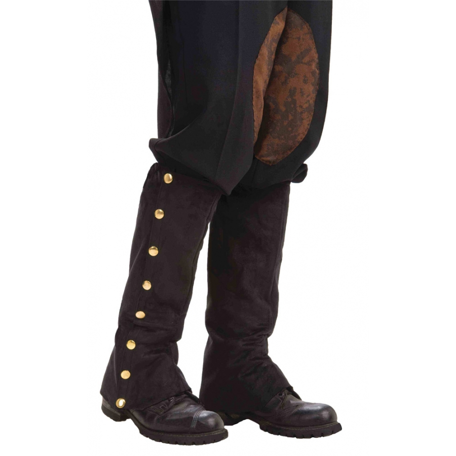 STEAMPUNK SPATS BLACK. A great accessory to your steampunk costume! Black boot-length spats which cover from top of calf to top of foot. Gold buttons on side. One size fits most.