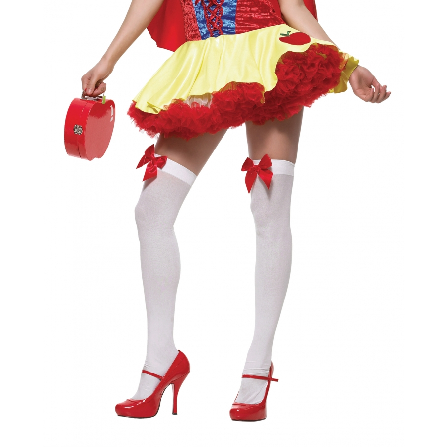 STOCKINGS THI HI W/BOW WT/RD. White thigh high stockings with red bows. One size fits most adults. Opaque nylon.