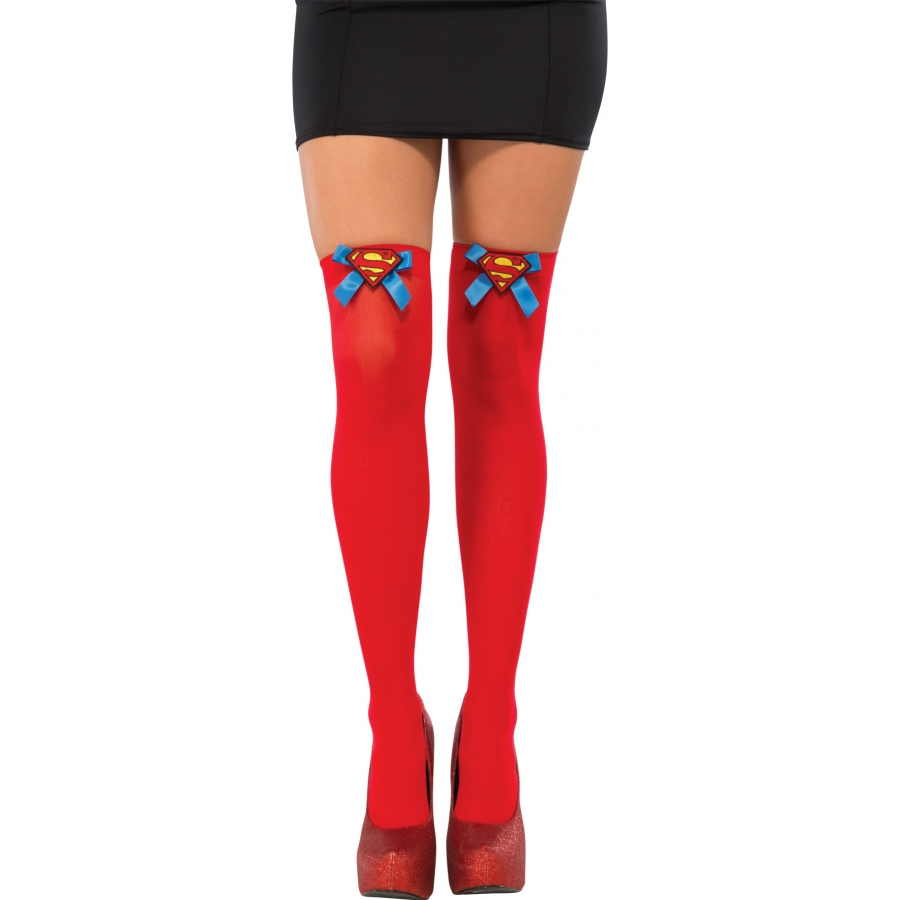 SUPERGIRL ADULT THIGH HIGH. The perfect accessory for your Supergirl outfit! Red thigh-highs with blue bows at the top with Superman insignia in the middle. One size fits most adults.