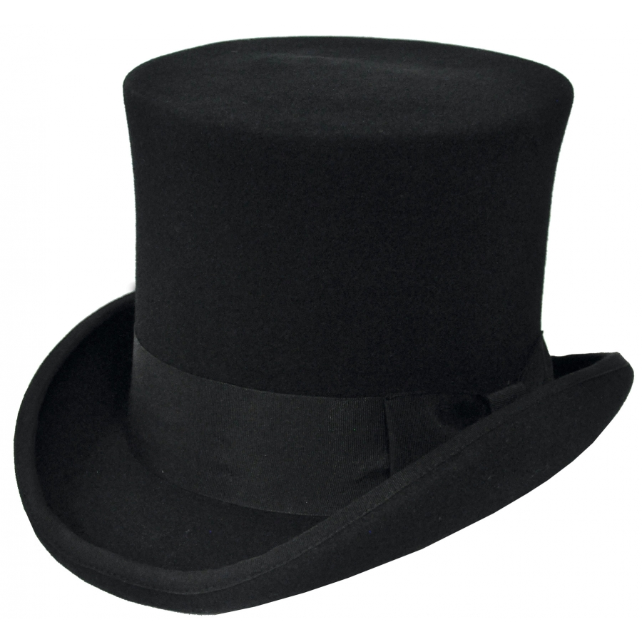 TALL HAT BLACK SMALL. One of our best quality hats. This is the hat for all grand occassions. Black wool. Brim measures 2 1/4 inches front, 1 1/4 inches side. Height 7 1/4 inches.
