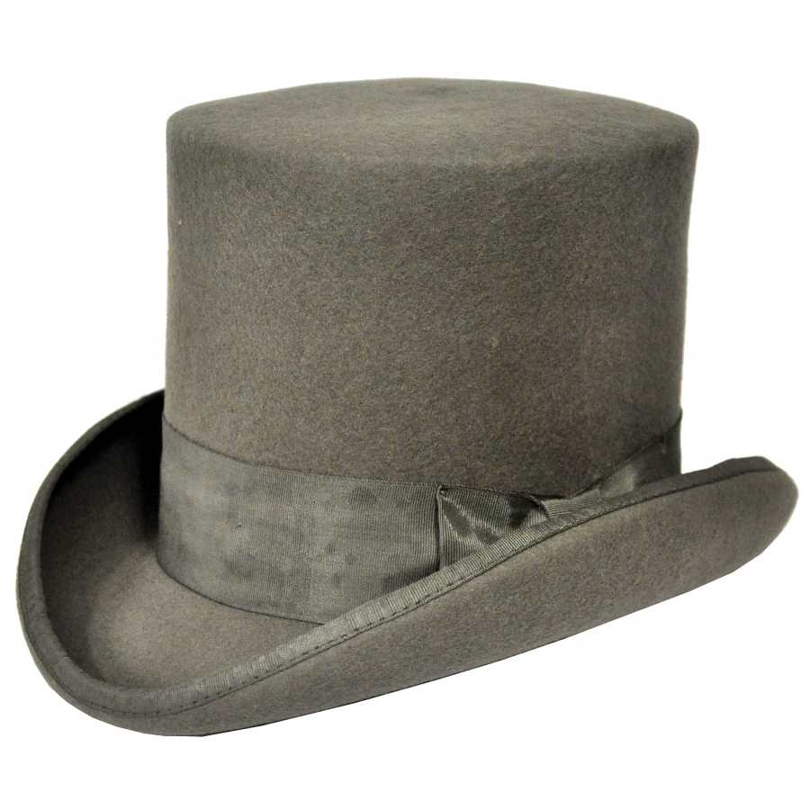 TALL HAT GREY MEDIUM. One of our best quality hats. This is the hat for all grand occassions. Grey wool. Brim measures 2 1/4 inches front, 1 1/4 inches side. Height 7 1/4 inches.
