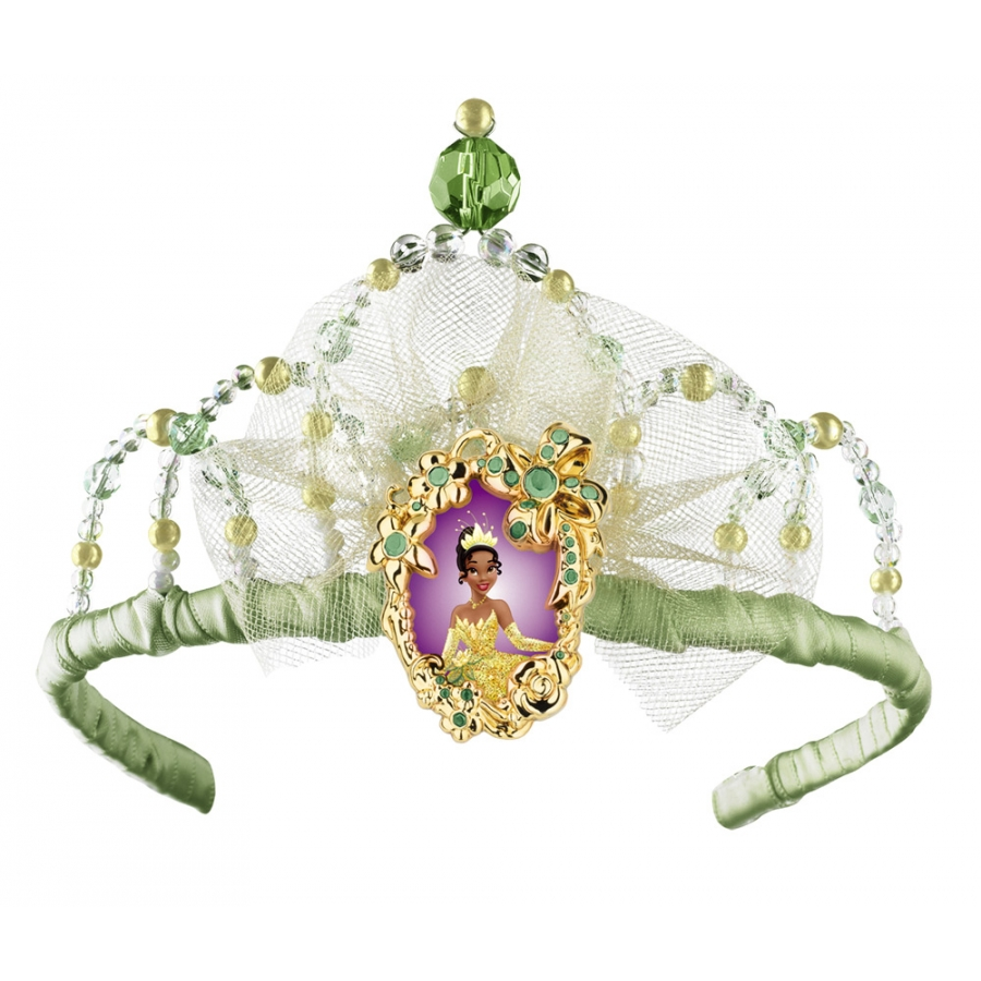 TIANA TIARA CHILD. The perfect accessory to your little princess’s costume of Tiana from Disney’s classic movie The Princess and The Frog! Green and yellow jewelled tiara with character cameo. One size fits most children.
