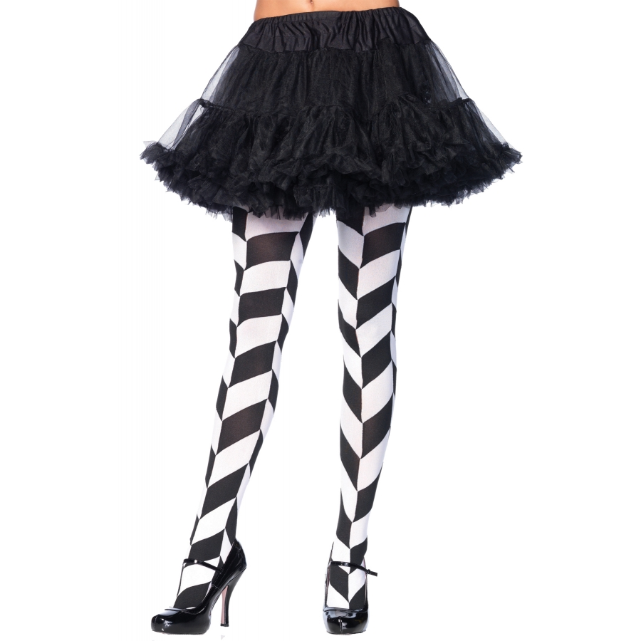 TIGHTS ILLUSION BLK/WHT. Stagard swirl design nylon tights give an illusion effect. One size fits most adults.
