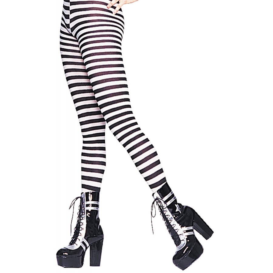 TIGHTS STRIPED BLACK WHITE. Striped tights to go with every costume. Polyester, nylon. One size fits most.