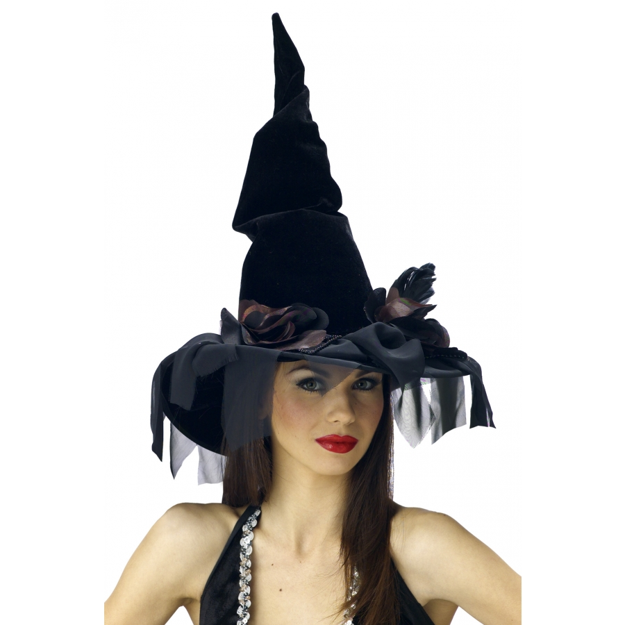 WITCH HAT DELUXE WINDING. Black velour witch hat with rust and black colored net roses, chiffon veils, and beads. Just twist and fluff the flower petals for a great look! Adjustable band and bendable wire for shaping the crown. Polyblend